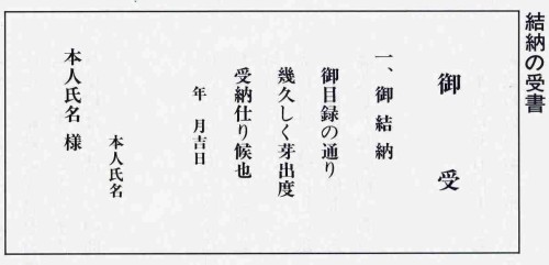 結納返しの準備 正式には 頂いた御結納品と同等、 もしくは少し控えめの緑白の紙折の御結納品を男性側に納めます。 最近は、頂戴した御結納品を利用し、 紙折のみ緑白にお色直しする略式の方が多くなっております。 小袖料の一割を袴料として、酒肴料は概ね同額を入れて準備します。 また婚約記念品の指輪の返礼で時計や礼服を差し上げる方が多いです。 お結納返しのお支度も当店にてできます。頂いたお結納を当店にご持参くださいませ。 専門店ですので、お相手がどの地方の方でも対応できます。 → ![]() → ![]() |