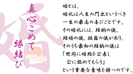| 結納は、うつくしい 結納品は、健康、長寿、発展、 幸福、節操、剛健、歓喜、 多産などの象徴として贈られます。 基本の品に鶴亀松竹梅の、 水引飾りをつけて贈ります。 松・・長寿と健康と年中緑を保つ弥栄を祝う。 竹・・節度、潔白、まっすぐな成長を祝う。 梅・・厳しい寒さに耐え春に先駆けて花を、 咲かせ実を結ぶことを祝う。 亀・・万年といわれる長寿の願いと急がず、 前へ進む努力の象徴。 鶴・・夫婦愛が強く、生涯一羽の相手としか、 交わらない貞操を保つ象徴 結納品、基本の品についてはコチラから。 |