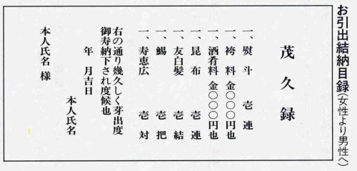結納の服装とは… 結納の服装は主に正装、純礼装、略礼装と分かれております。 父親の正装はモーニングや紋付袴、母親は色留などが主流でございます。 くわしくはコチラをご覧くださいませ。 結納式の次第とは… 結納式の次第には様々なものがございます。 コチラでは仲人様がいらっしゃる場合の参考例を紹介いたします。 ご養子様結納 ご養子様の場合は 女性側が緑白の紙折の御結納品を男性側に納めます。 お結納金を袴料として、酒肴料も袴料の一割をおいれします。 (目録例) ![]() |